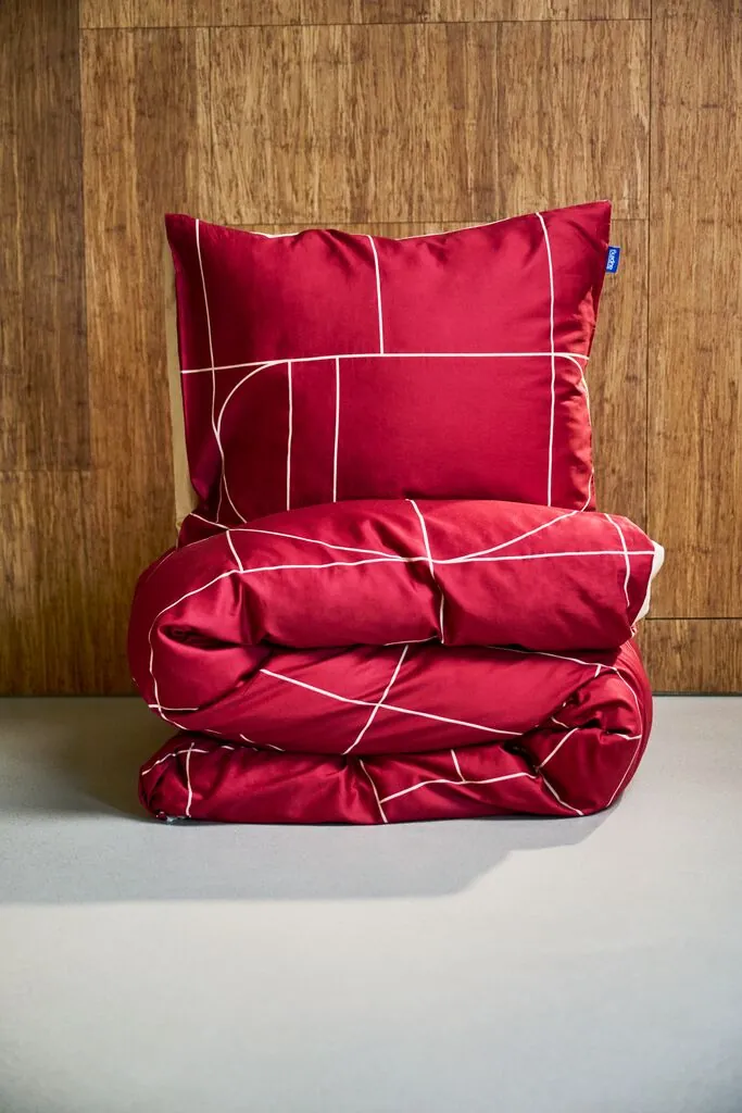 Het Auping Graphic bordeaux dekbedovertrek heeft een dieprode bordeauxkleur met een subtiel grafisch beige lijnenspel dat de slaapkamer een rustige, maar onderscheidende uitstraling geeft. De omkeerbare achterkant in warm beige biedt variatie in stijl, zonder het interieur te overschaduwen. De katoensatijnstof voelt prettig en soepel aan op de huid en laat zien dat het dekbedovertrek aandacht besteedt aan zowel uiterlijk als gebruiksgemak.